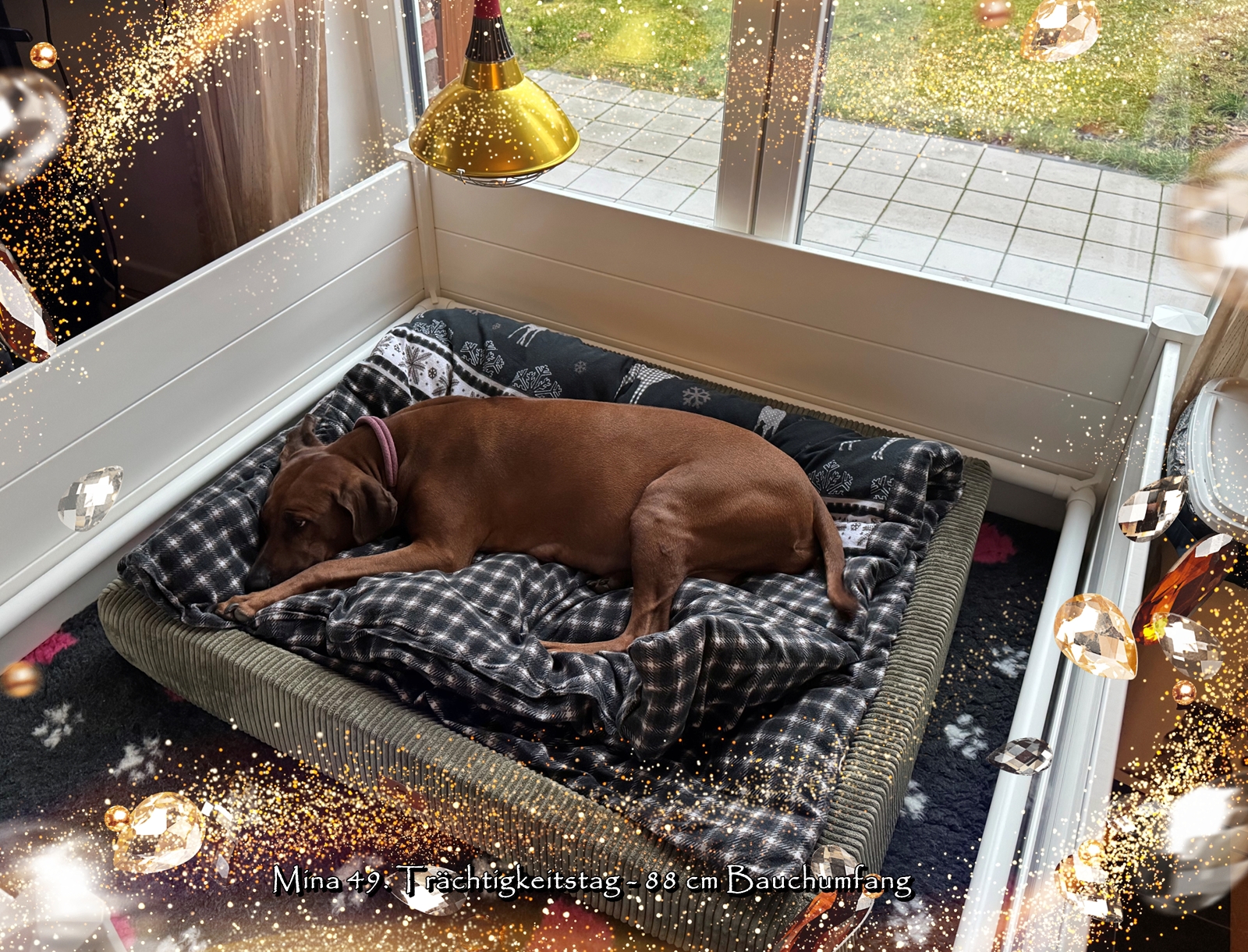 Mina ist in die Wurfbox umgezogen und macht es sich gemütlich. Wir haben heute den 49. Trächtigkeitstag und sie hat aktuell einen Bauchumfang von 88 cm (+ 29 cm). Sie sieht nicht so rund aus, wie wir erwartet hätten, von daher gehen wir eher von einem kleineren Wurf aus. Wir lassen uns überraschen und sind sehr gespannt. Das wichtigste ist für uns, dass Mina alles gut übersteht und es den kleinen Schokoküssen gut geht 🙏 🤎.