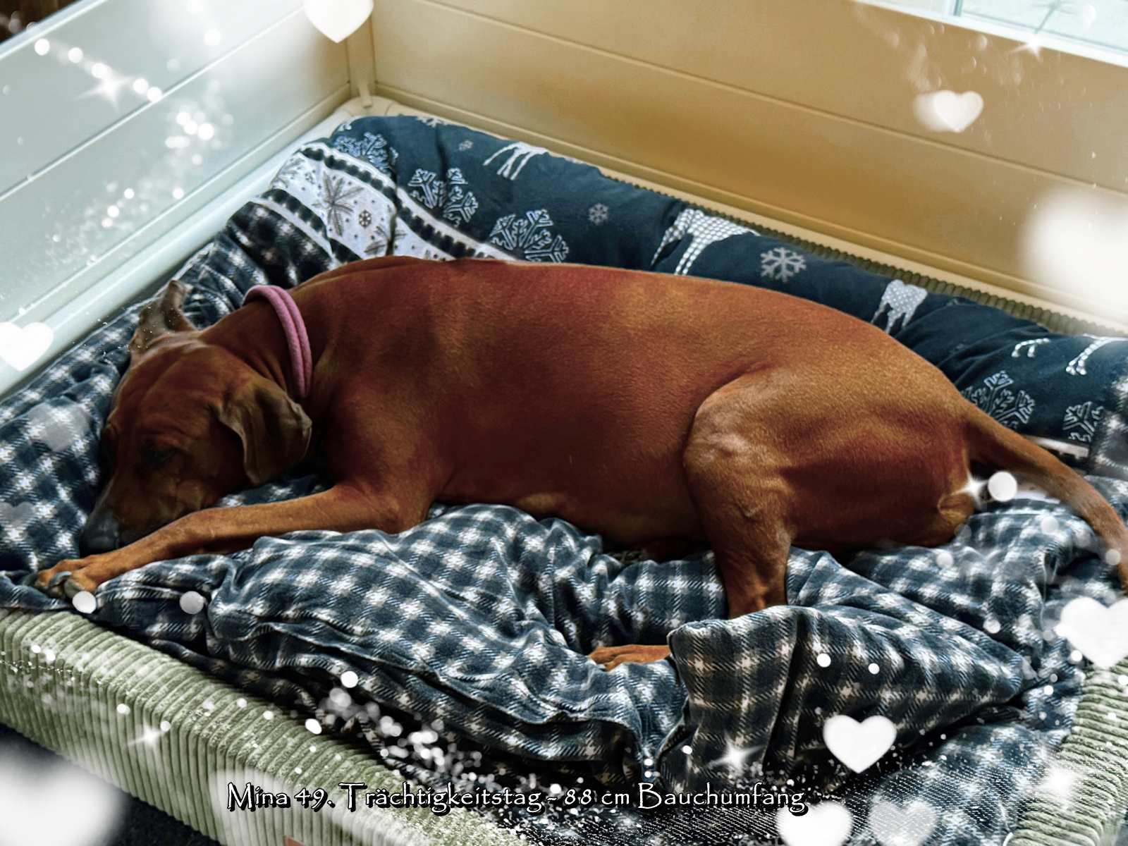 Mina frisst zwar noch, aber sehr verhalten und mäkelig. Nachts schläft sie seit einer Woche mit bei uns im Schlafzimmer, damit wir alles im Blick haben. Sie weiß nicht mehr so recht wie sie liegen soll und es scheint auch sehr zu drücken. Die kleinen strampeln und treten schon ganz ordentlich in ihrem Bauch. Sie ist sicher froh, wenn sie ihre Welpenschaukel ablegen kann. All zu lange wird es wohl auch nicht mehr dauern, wir sind ständig in ihrer Nähe und achten auf das, was sie uns mitteilt. Ein paar Tage muss sie noch durchhalten 🙏… dann können die Kleinen sich auf den Weg machen 🐾 💞